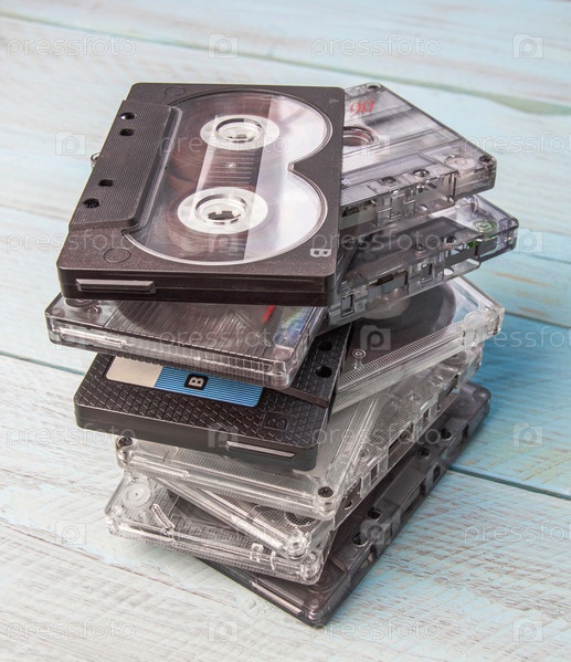 Небрежная стопка аудиокассет стоит на синем деревянном фоне. Вертикальная ориентация
