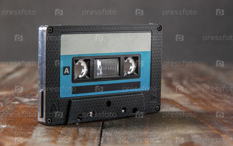 Аудиокассета в классическом черном футляре стоит на коричневом деревянном фоне