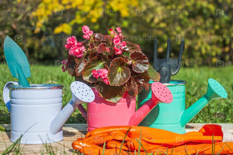 Три разноцветные декоративные лейки с цветком бегонии и садовый инструмент стоят на досках в саду. Рядом оранжевые рабочие перчатки