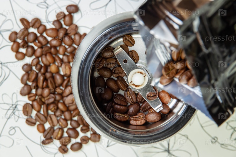 Электрическая кофемолка с кофейными зернами на фоне размытой горсти кофейных зерен на столе