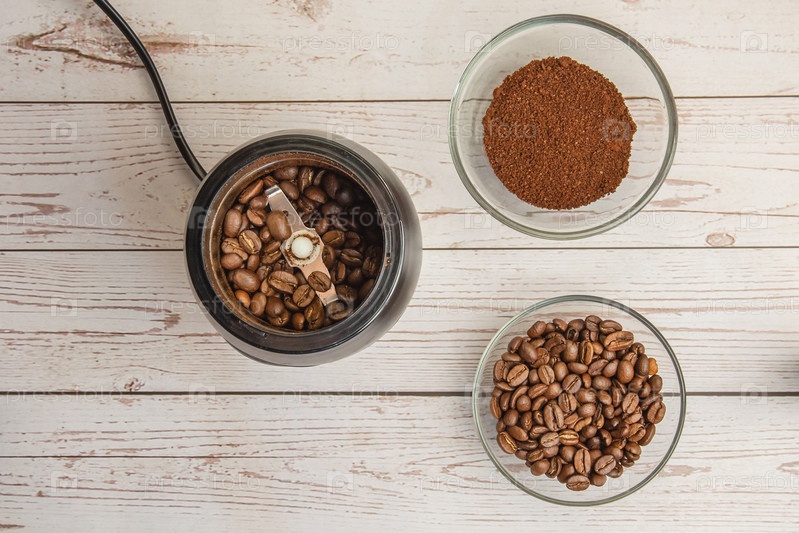 Кофейные зерна на мельнице и молотый кофе в миске на деревянном фоне