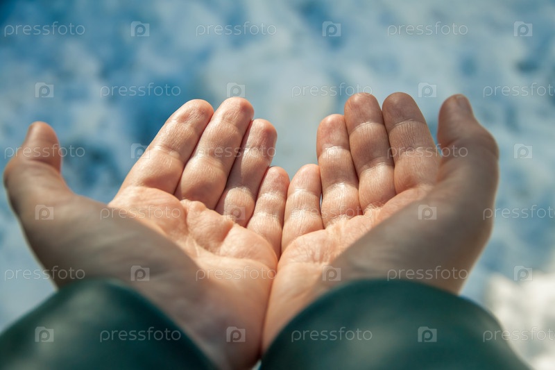 Две женские руки сложены в лодке и просят милостыню. Выборочный фокус