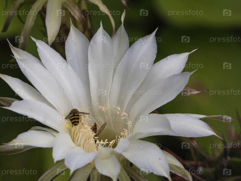 Насекомые опыляют красивый большой белый цветок кактуса. Крупный план нежных белых лепестков и желто-кремовых тычинок цветущего кактуса на зеленом фоне сада