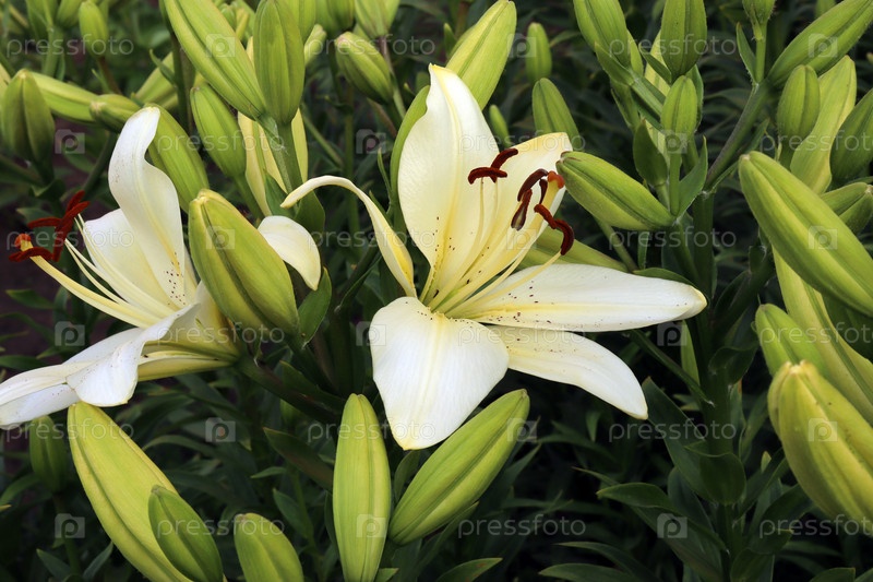 Цветущие белые лилии и нераспустившиеся бутоны в летнем саду