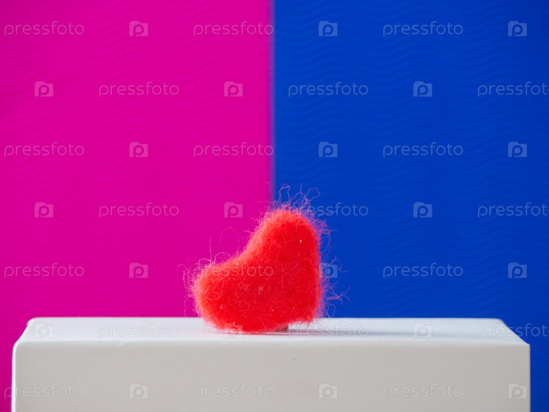 Красное сердце как символ любви стоит на коробке на розово-голубом фоне. Открытка ко дню святого Валентина