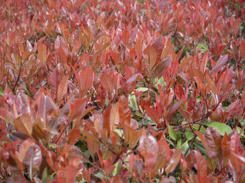 Естественный фон из красных и зеленых листьев. Ветки кустарников с молодыми красно-оранжевыми листьями