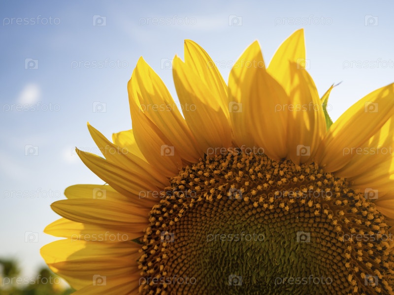 Красивая часть с лепестками большого подсолнуха на фоне голубого неба крупным планом. Ярко-желтый подсолнух с семенами. Органическая и вегетарианская пища