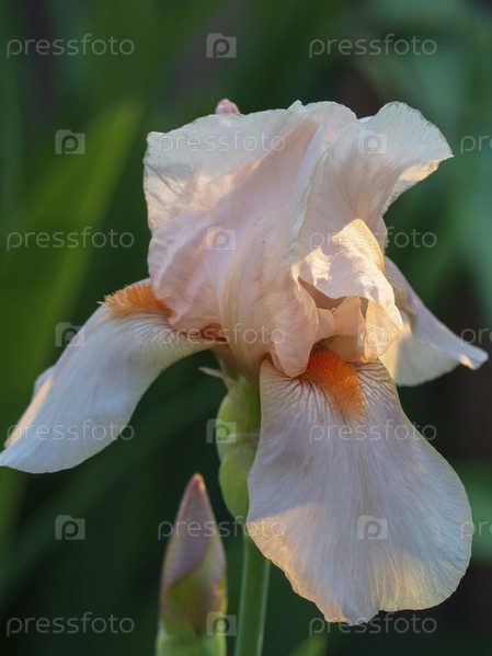 Розовый цветок ириса. Крупный план нежной розовой бородатой радужной оболочки на зеленом фоне