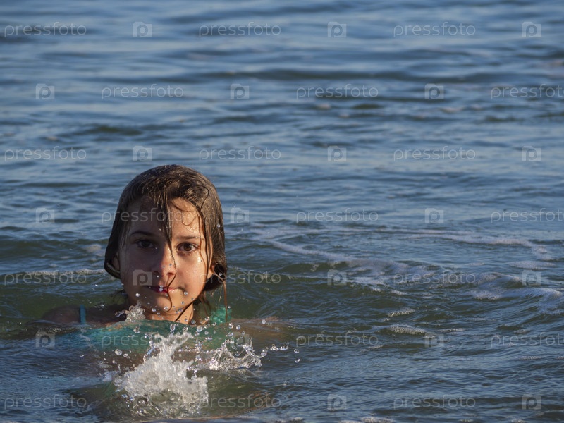 Красивая девушка купается в море под лучами заходящего солнца. Девочка-подросток наслаждается теплой морской водой. Реальная жизнь, место для текста