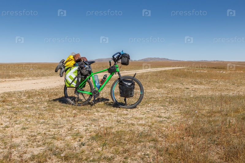 Туристический велосипед, полностью загруженный, стоит на грязной дороге. туристический велосипед с сумками. Монгольская степь