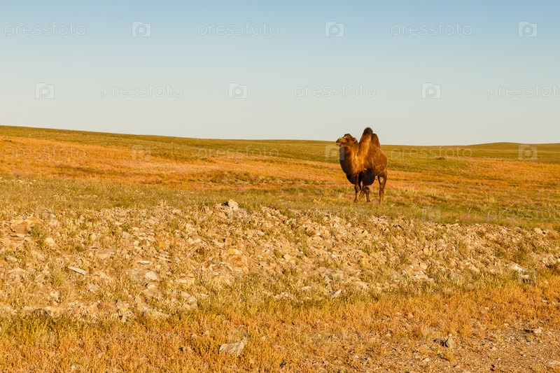 Один верблюд гуляет по пустыне Гоби Монголия