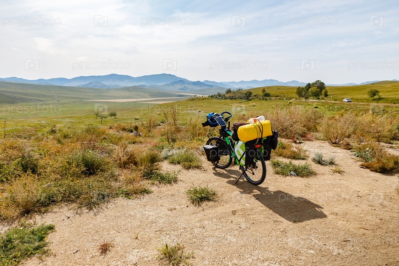 Велосипед путешественника с сумками, пейзаж в монголии, приключенческое путешествие на велосипеде, туристический велосипед