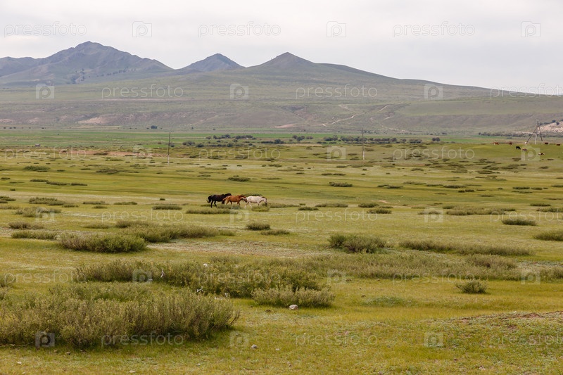 Монгольский пейзаж, три разноцветных лошади бегут по степи, Орхонская долина