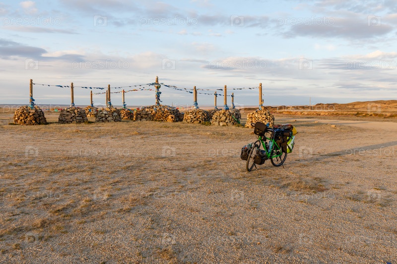 Туристический велосипед и монгольское овоо, Церемониальная каменная куча на вершине горы, Монголия