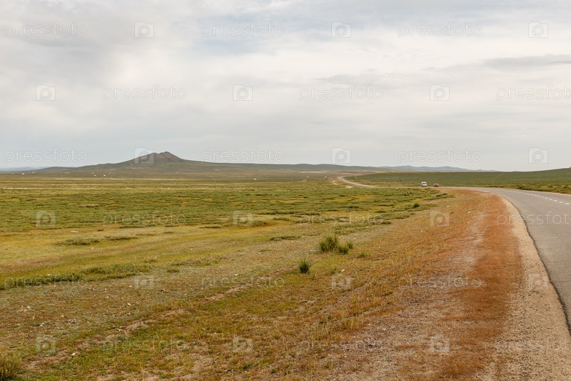 Монгольская степь, красивый ландшафт с дорогой и облачным небом