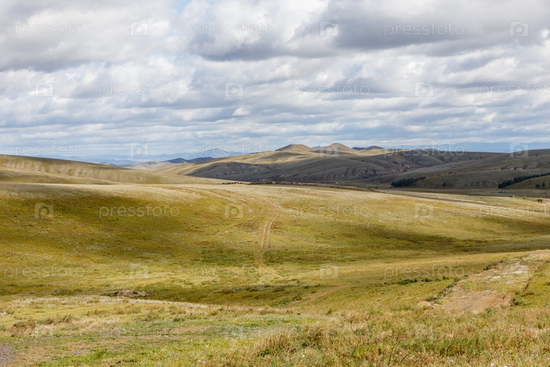 Красивый монгольский пейзаж, полевая дорога идет в горы