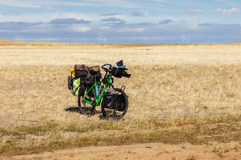 Дорожный велосипед с сумками, Велоприключенческий туризм, Туристический велосипед Пустыня Гоби Монголия