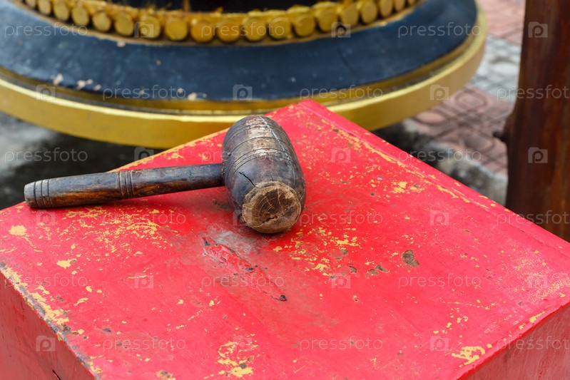 Деревянный молоток для удара по буддийскому гонгу лежит на красной коробке