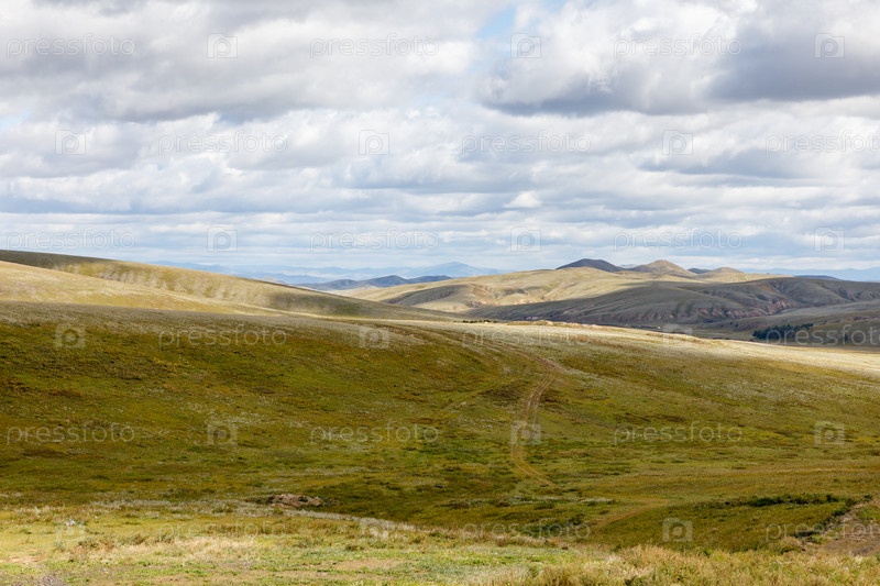 Монгольский пейзаж, зеленые пастбища на холмах Монголии