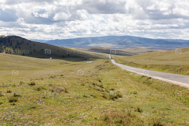 Асфальтовая дорога Дархан-Улан-Батор в Монголии, красивый монгольский пейзаж