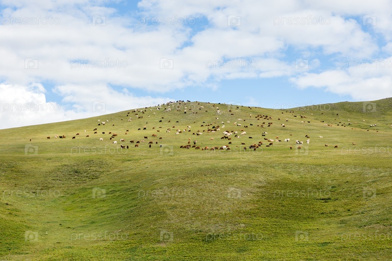 Стадо овец и коз пасутся в монгольской степи, Монголия