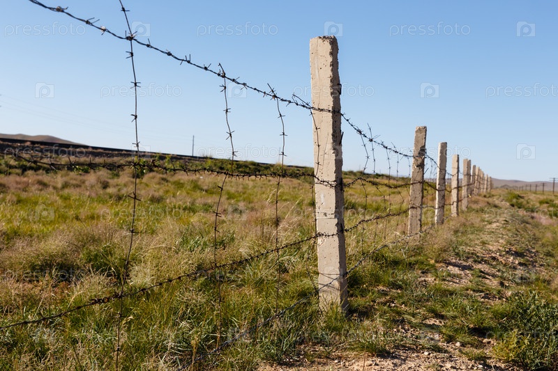 Забор из колючей проволоки, отделяющий железную дорогу от степи, Монголия