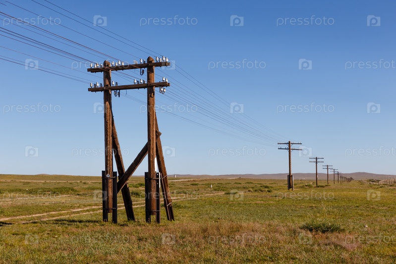 ВЛ на деревянных опорах в монгольской степи, Монголия