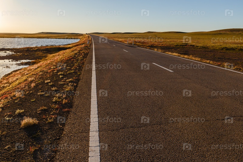 Асфальтовая дорога в монгольской степи вдоль небольшого озера, Монголия