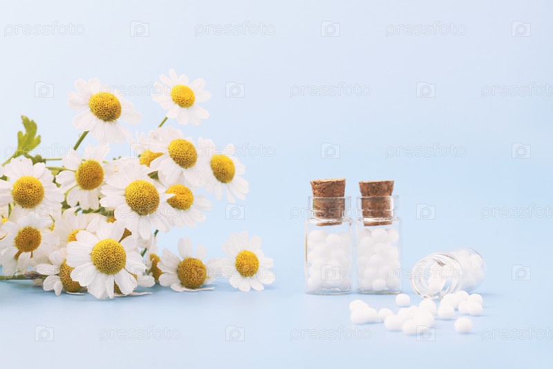 Гомеопатические глобулы и стеклянные бутылки на синем фоне рядом с лекарственными цветами ромашки