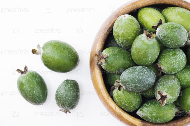 Зеленые плоды фейхоа в деревянной тарелке на белом фоне. Тропический фрукт фейхоа. Набор спелых плодов фейхоа. Копировать пространство