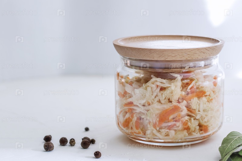 Квашеная капуста в стеклянной банке. Домашняя квашеная капуста с морковью. Ферментированная пища. Натуральный пробиотик. Домашняя капуста. Скопируйте место для текста