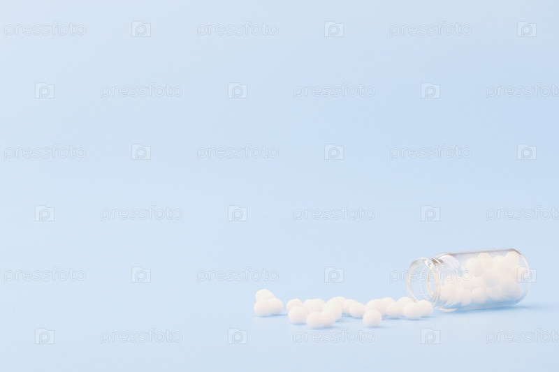Гомеопатические глобулы и стеклянная бутылка на синем фоне. Травы альтернативной гомеопатии, лечение и таблетки