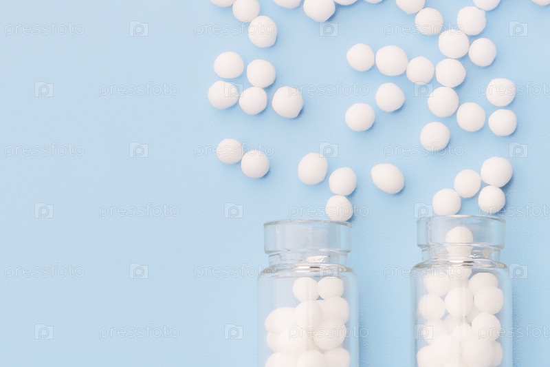 Гомеопатические глобулы и стеклянная бутылка на синем фоне. Травы альтернативной гомеопатии, лечение и таблетки