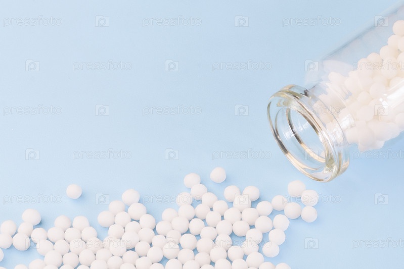 Гомеопатические глобулы и стеклянная бутылка на синем фоне. Альтернативная гомеопатическая медицина