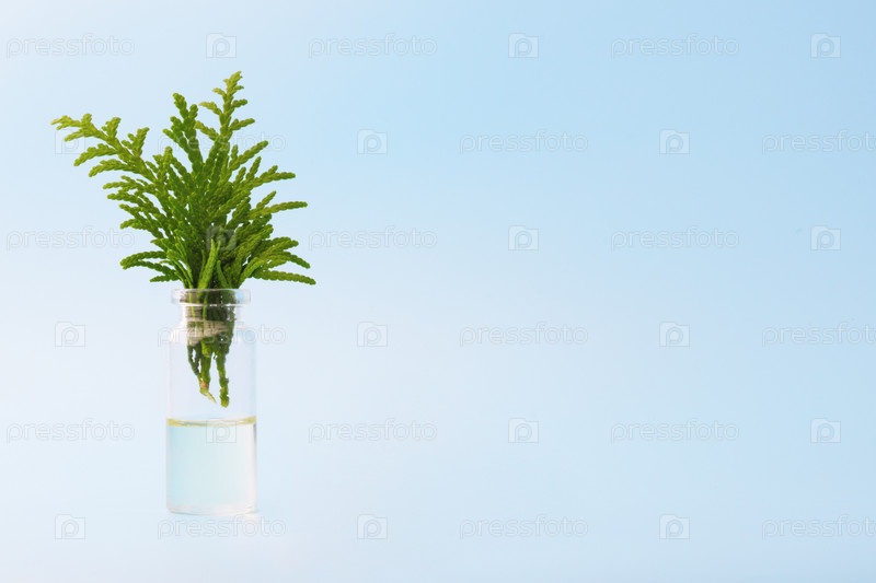 Бутылка эфирного масла со свежими ветвями можжевельника крупным планом на синем фоне