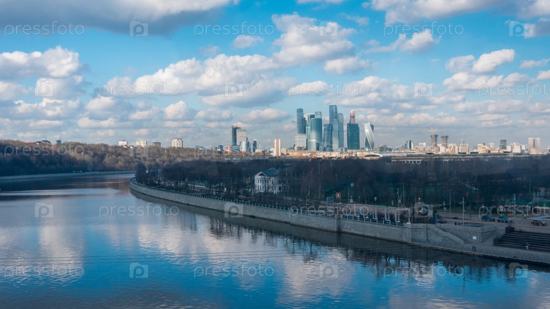 Международный финансовый и деловой торговый центр Москва-Сити в российской столице. Гигантские металлические небоскребы под ярким солнцем. Солнечный свет отражается на огромном здании