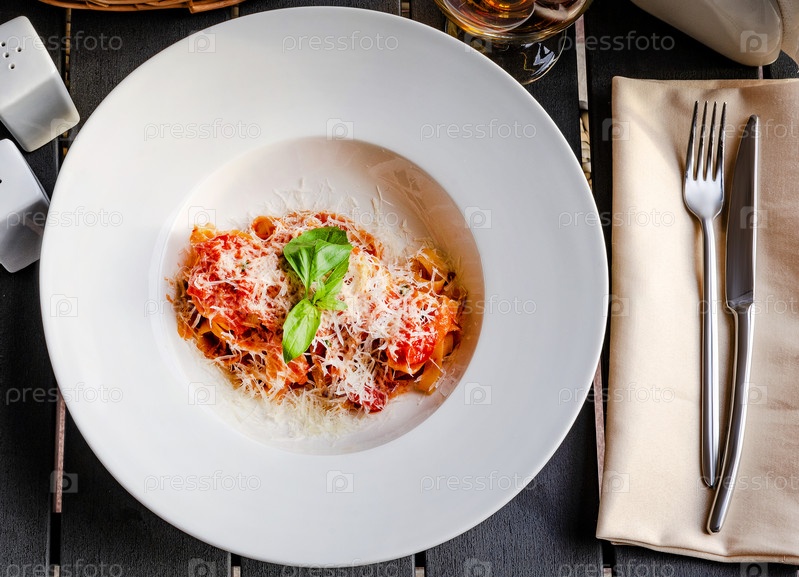 Итальянская паста с помидорами, сыром и веточкой базилика