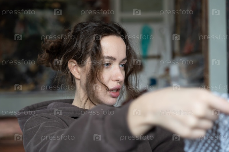 Портрет молодой красивой женщины в коричневом свитере в студии