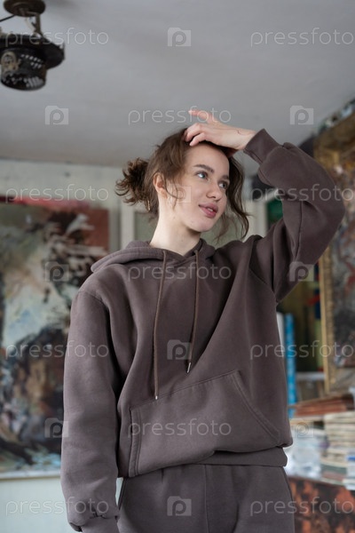 Портрет молодой красивой женщины в коричневом свитере в студии