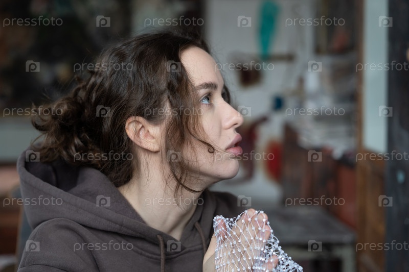 Портрет молодой красивой женщины в коричневом свитере в студии