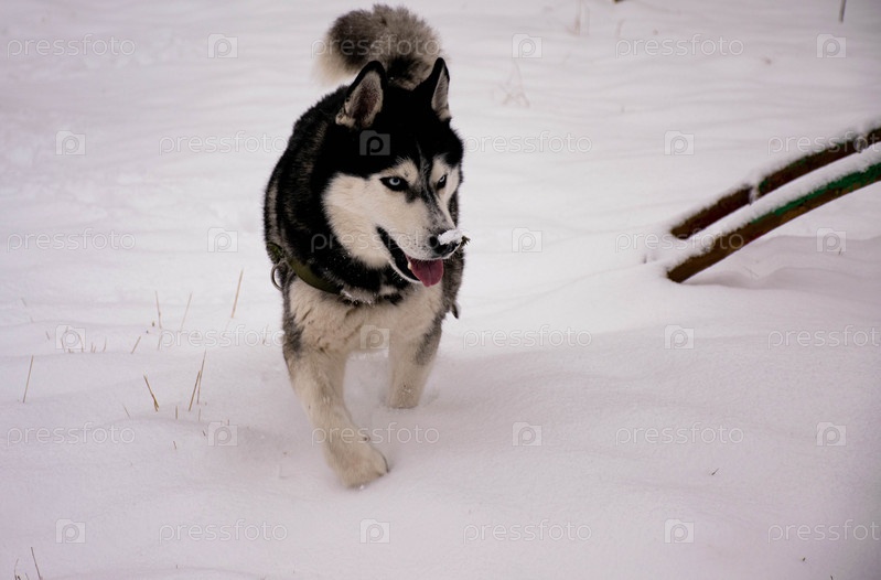 Хаски в шлейке бежит по снегу
