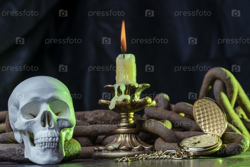Волшебный череп на деревянном столе, горящая свеча в цепях и часы, остановившие время