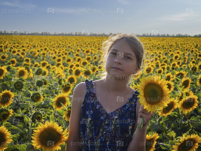 Красивая девушка в поле подсолнухов. Девочка-подросток с блестящими от солнца волосами окружена цветущими подсолнухами с цветами в руках
