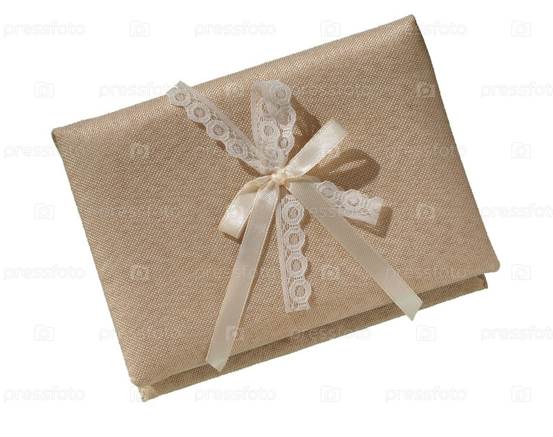 Подарочная коробка из бежевой фактурной ткани с кружевным бантом, изолированным на белом фоне, вид сверху. Красивая подарочная коробка, обтянутая кремовой тканью, высокое разрешение, большая глубина резкости