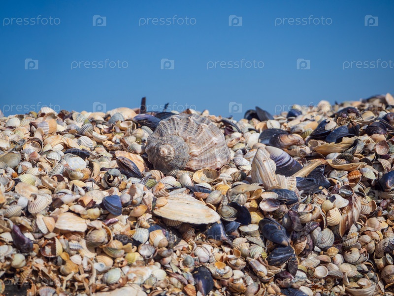 Фоновое изображение пляжа. Одна большая ракушка лежит на куче разноцветных маленьких ракушек на фоне голубого неба. Природа фон или баннер для концепции пляжного отдыха