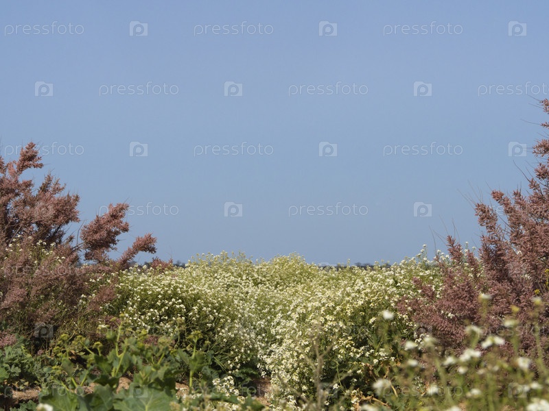 Белая река цветов течет между берегами кустов с розовыми цветами на фоне голубого неба. Нежный естественный фон для открытки. Красивые обои
