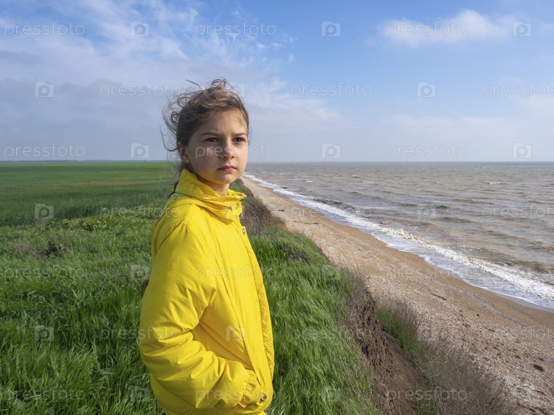 Девушка в желтой ветровке смотрит вдаль, стоя на зеленом травянистом лугу у высокого берега на фоне голубого неба и серого моря