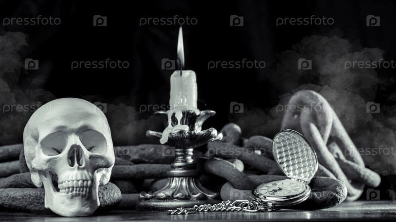 Волшебный череп на деревянном столе, горящая свеча в цепях и часы, остановившие время