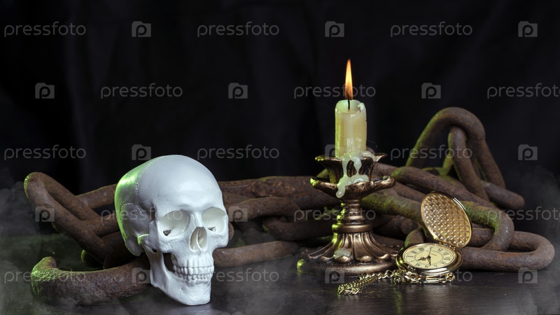 Волшебный череп на деревянном столе, горящая свеча в цепях и часы, остановившие время