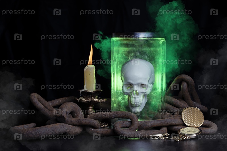 Светящийся волшебный череп в банке на прикованном деревянном столе. Дым исходит от свечи, старые часы остановили время